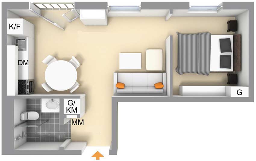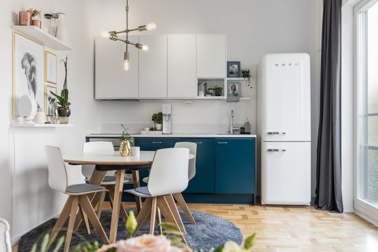 Dù có diện tích khá nhỏ nhưng căn hộ nhỏ xinh này vẫn có đầy đủ các khu vực chức năng gồm: phòng bếp, phòng ngủ riêng tư, khu vực tiếp khách và nhà vệ sinh.