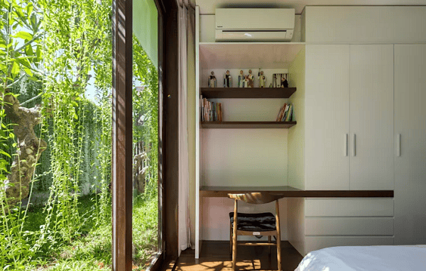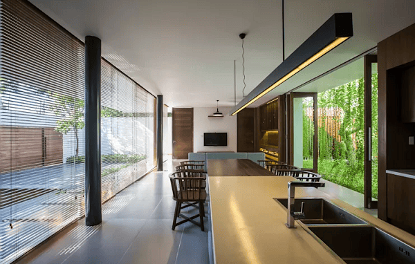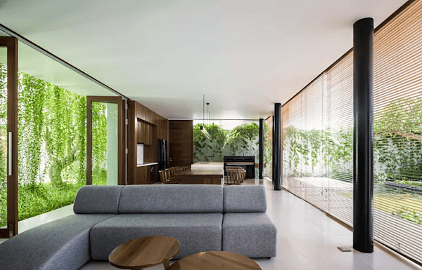 Các căn phòng trong nhà được thiết kế dạng hộc kéo, khi kéo ra để lại các khoảng trống, đó là những hành lang xanh với dây leo kín tường. Các kiến trúc sư đã tối giản số lượng màu sắc sử dụng ở đây bằng cách sử dụng sơn tường màu trắng và vách ngăn là các cột gỗ để làm nổi bật lên khoảng tường xanh mướt mát.